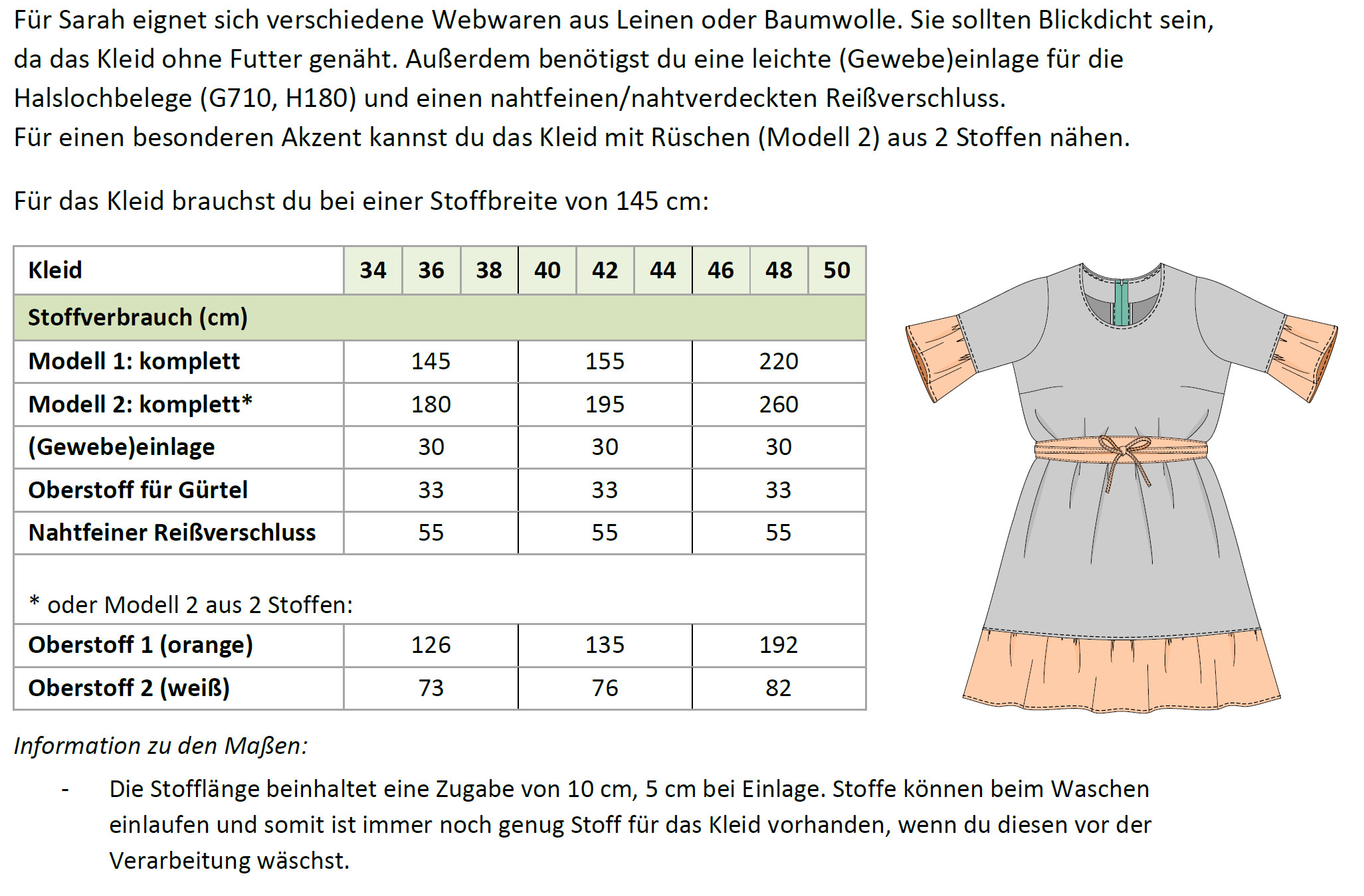 Du kannst „Sarah“ aus verschiedenen Webstoffen wie Leinen, Baumwolle oder Musselin nähen. Für einen besonderen Akzent kannst du die Rüschen mit Lochstickerei oder Spitze gestalten. Je nach Stoffwahl wirkt das Kleid elegant oder sommerlich verspielt.